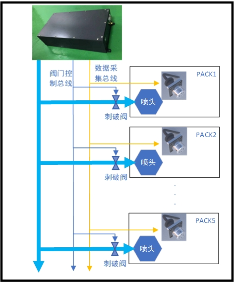 Ø 以点喷的方式,保证pack内长时间的全氟己酮气体浓度,保证在半小时内,pack内不起火,能量逐步释放,从源头解决新能源锂电池燃烧问题。